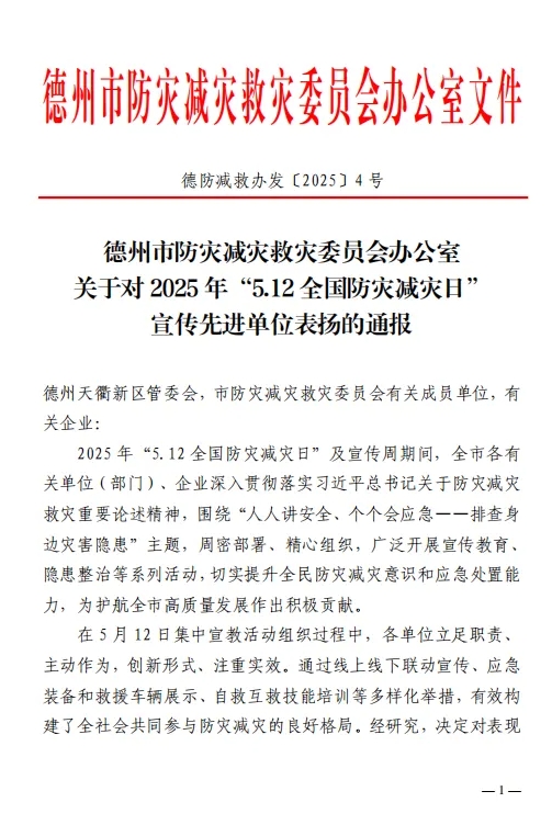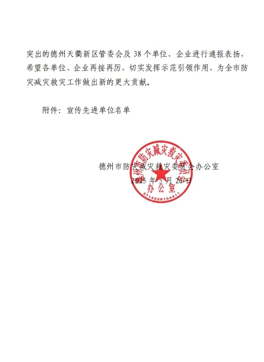 德州市防灾减灾救灾委员会办公室于2025年5月26日发布通报,对在2025年“5.12全国防灾减灾日”及宣传周期间表现突出的单位和企业予以表扬。