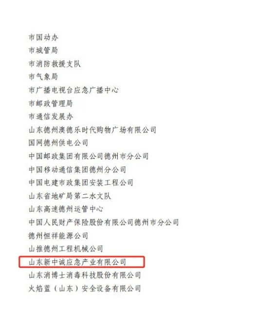 山东新中诚应急产业有限公司获德州市防灾减灾救灾工作通报表扬!